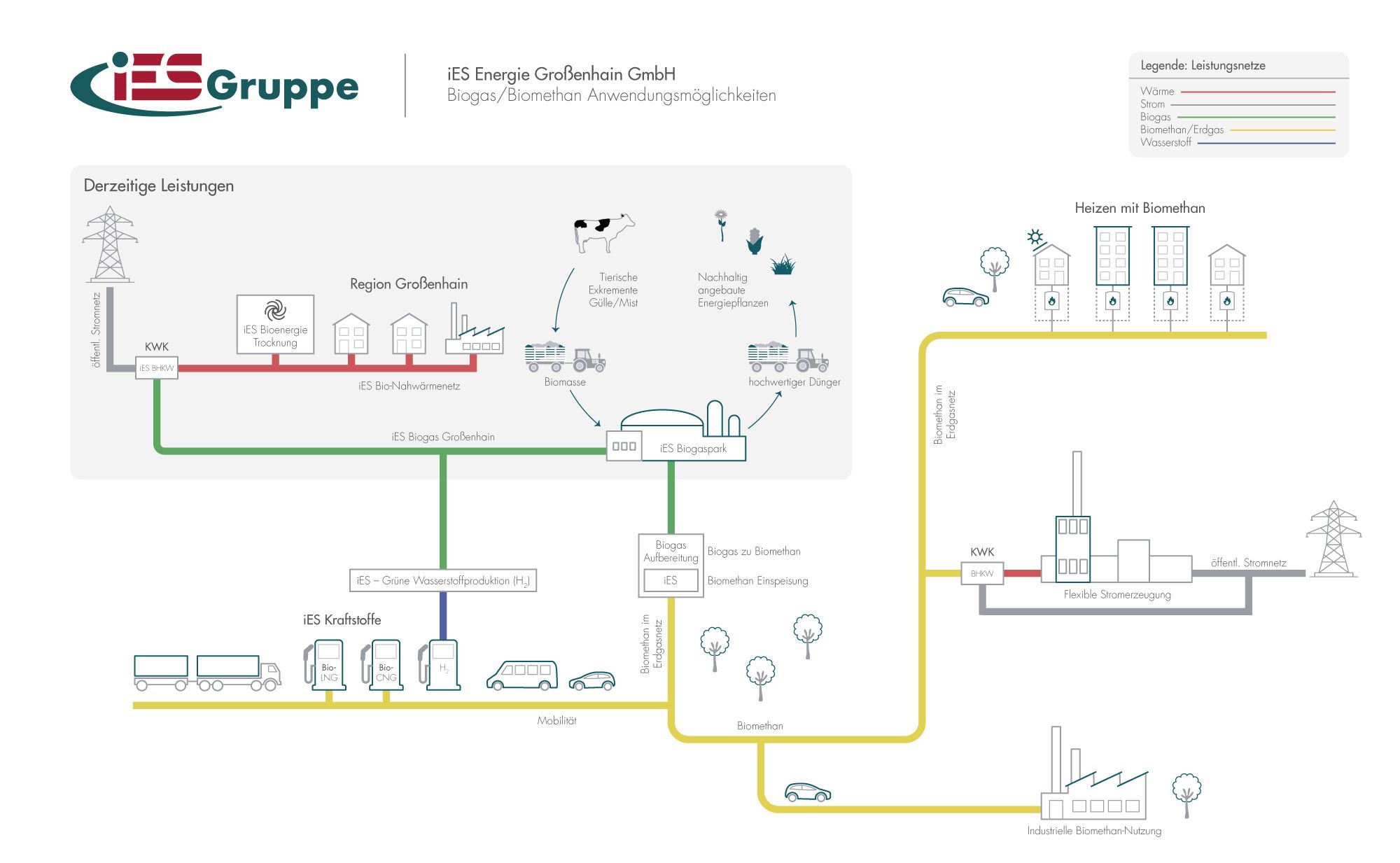 Am Ort der Produktion in Großenhain wird es technisch zu iES Biomethan aufbereitet und in das vorhandene Biomethan-/Erdgasnetz eingeleitet und gepeichert.